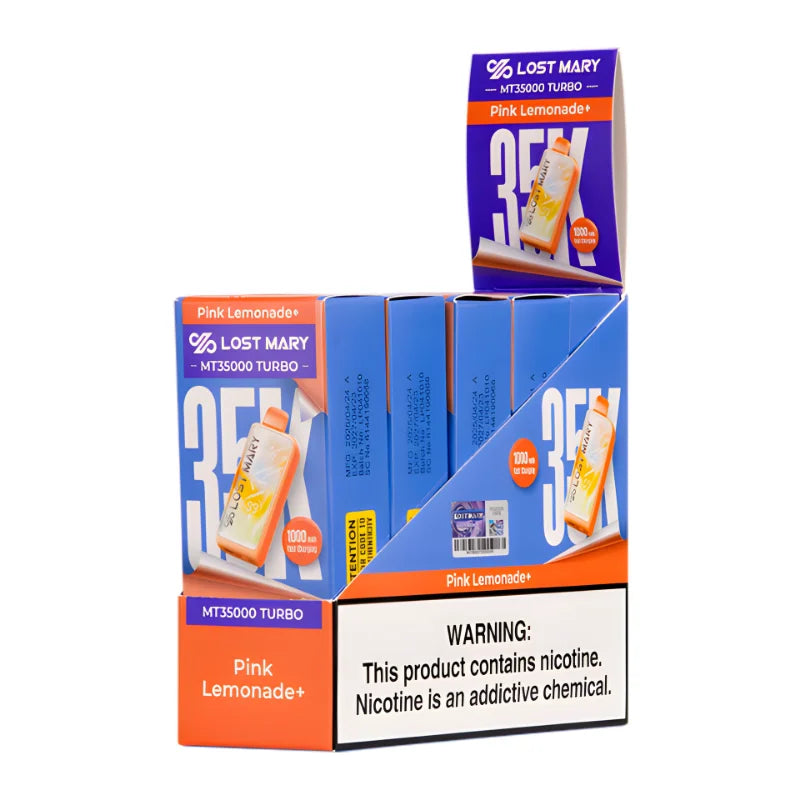 Pink Lemonade+ Lost Mary MT35000 Turbo is available at DisposableVape and is manufactured in China. It delivers up to 35,000 puffs using an 18mL prefilled salt nicotine capacity. A 1000mAh rechargeable battery supports Smooth and Turbo output modes. Fast USB-C charging reduces charging downtime, and performance exceeds typical industry standards.