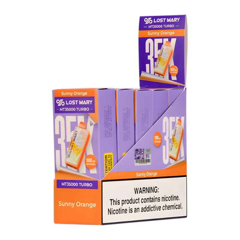 Sunny Orange Lost Mary MT35000 Turbo is available at DisposableVape and is manufactured in China. It delivers up to 35,000 puffs using an 18mL prefilled salt nicotine capacity. A 1000mAh rechargeable battery supports Smooth and Turbo output modes. Fast USB-C charging reduces charging downtime, and performance exceeds typical industry standards.