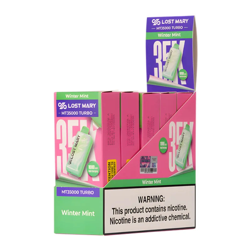 Winter Mint Lost Mary MT35000 Turbo is available at DisposableVape and is manufactured in China. It delivers up to 35,000 puffs using an 18mL prefilled salt nicotine capacity. A 1000mAh rechargeable battery supports Smooth and Turbo output modes. Fast USB-C charging reduces charging downtime, and performance exceeds typical industry standards.